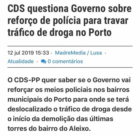 Os deputados do CDS enviaram esta sexta-feira um requerimento ao ministro da Administração Interna, Eduardo Cabrita, questionando-o sobre o tráfico e do consumo de estupefacientes nos bairros municipais do Porto situados na envolvente do antigo Bairro do Aleixo, nomeadamente Lordelo, Pinheiro Torres, Pasteleira e Mouteira. No documento, os...